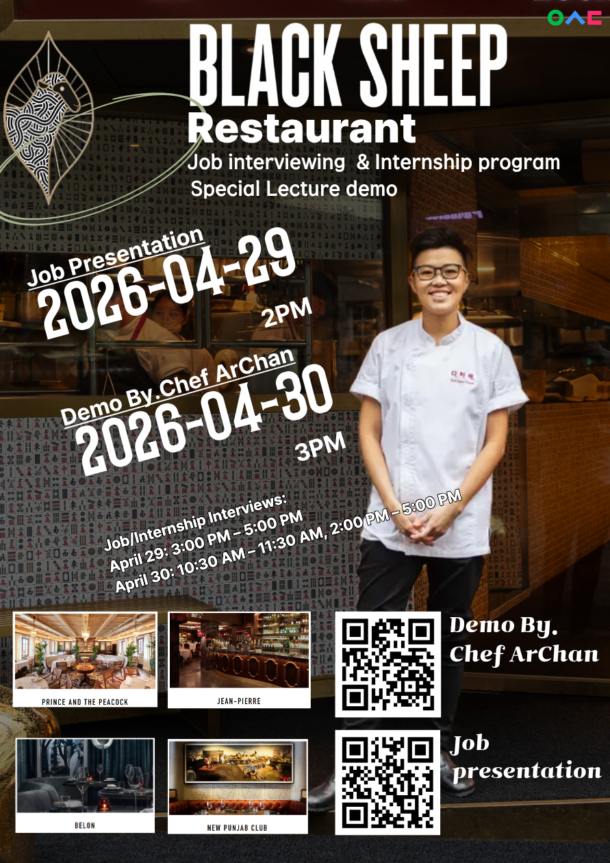 4월 29일과 30일 양일간 본교를 방문하여 인턴십 - 주방조리(commis), 경영 트레이니(Management Trainee) 직책에 지원할 학생들을 모집할 예정입니다.