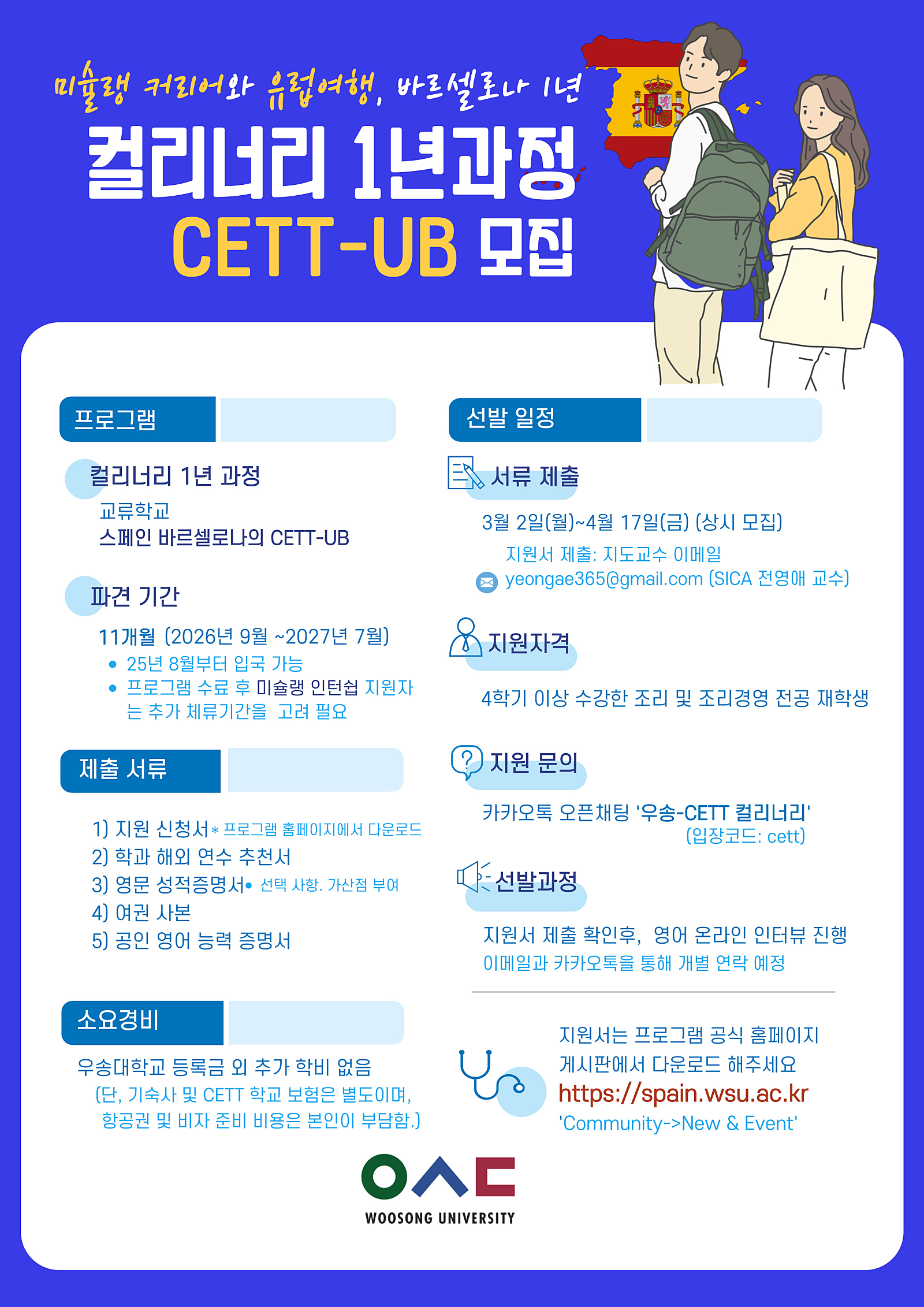 커뮤니티 공지사항 학과뉴스 포토갤러리 자료실 관련사이트 공모전&대회공지 공지사항Home커뮤니티공지사항 [스페인 CETT-UB 프로그램 모집 안내] 작성자 : 학과관리자 | 작성일 : 2026.03.18 | 조회수 : 20 [스페인 CETT-UB 프로그램 모집 안내] 대상: 3학년 2학기 지원자고려 기간: 26학년도 2학기~27학년도 1학기(1년과정) * 4학년 1학기 진행되는 졸업연구과제 이수를 위한 별도 인정과제 부여 * 신청 전 댓글 및 학과장 면담 필수! 첨부파일 cett.png 목록 이전글 [이탈리아 ALMA 프로그램 모집 안내] 다음글 2025학년도 RISE 얼리버드 취업 4i ICC기반 단과대학별 취업박람회 개최