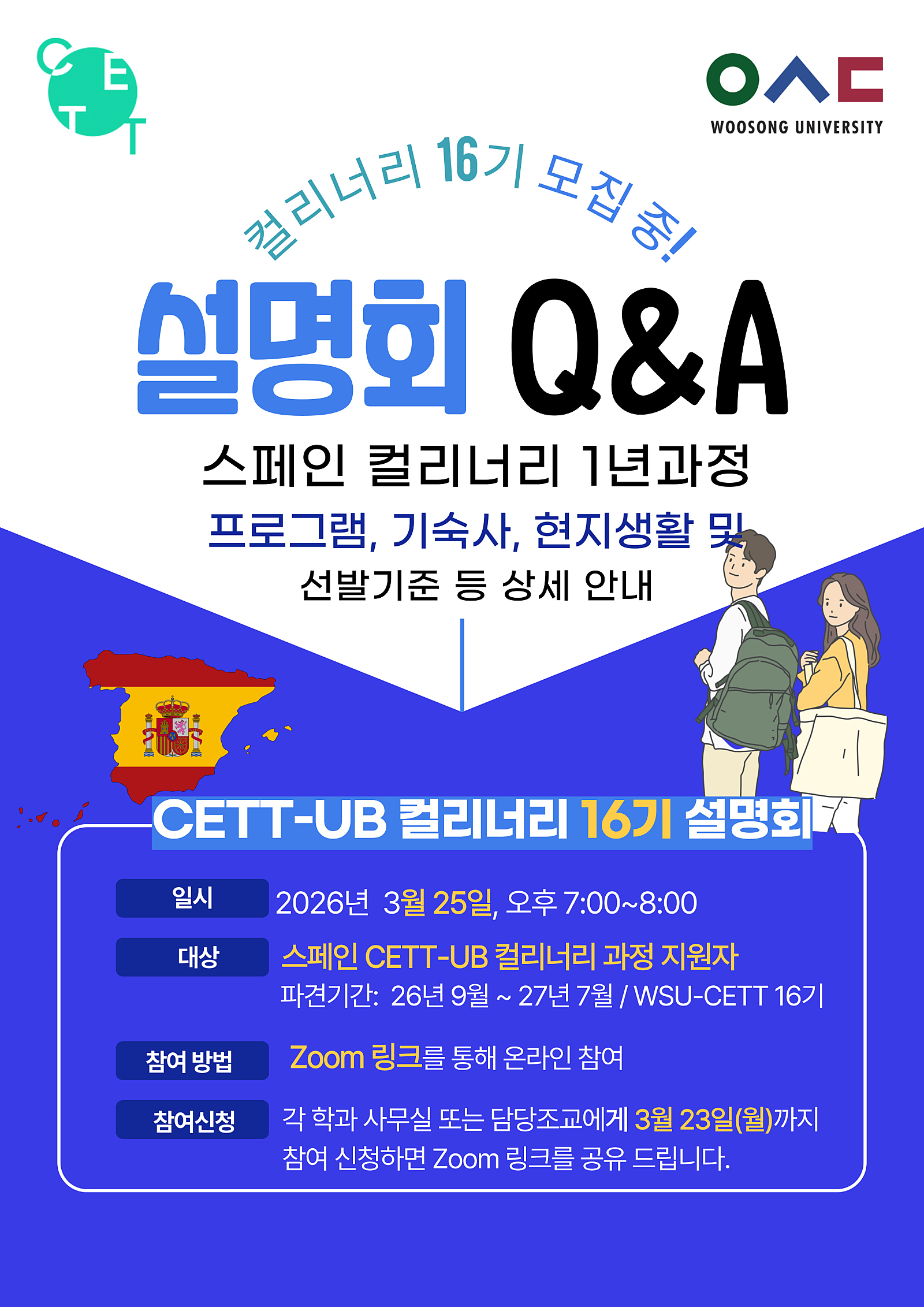 커뮤니티 공지사항 학과뉴스 포토갤러리 자료실 관련사이트 공모전&대회공지 공지사항Home커뮤니티공지사항 CETT-UB 컬리너리 16기 설명회 안내 작성자 : 학과관리자 | 작성일 : 2026.03.18 | 조회수 : 22 CETT 9월 프로그램 Zoom 설명회가 다음과 같이 있을 예정입니다. [설명회 주요 내용] 일시: 2026년 3월 25일(수) 오후 7:00 – 8:00 방법: Zoom 온라인 실시간 설명회 대상: CETT-UB 16기(26년 9월 파견) 지원 관심 학생 전원 첨부파일 CETT설명회.png 목록 이전글 2026학년도 2학기 Woosong University Kazakhstan 교환학생 모집 안내 다음글 한식 명인 세미나 특강 안내